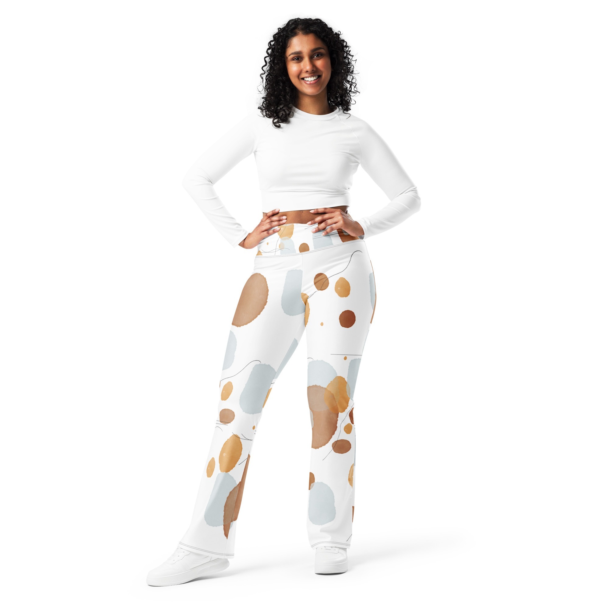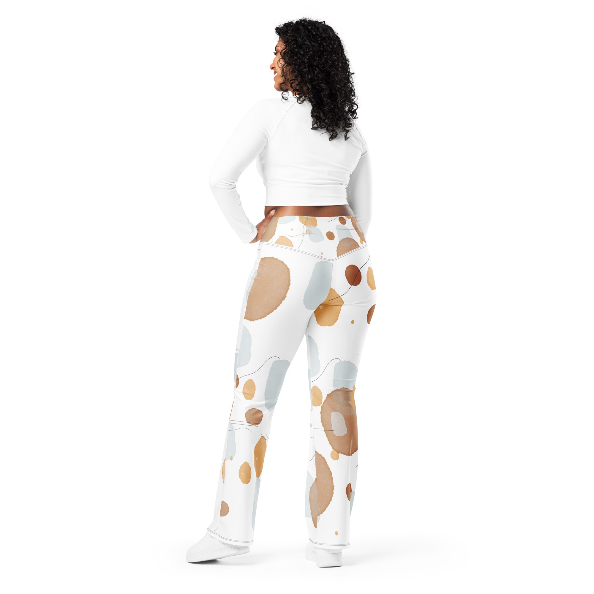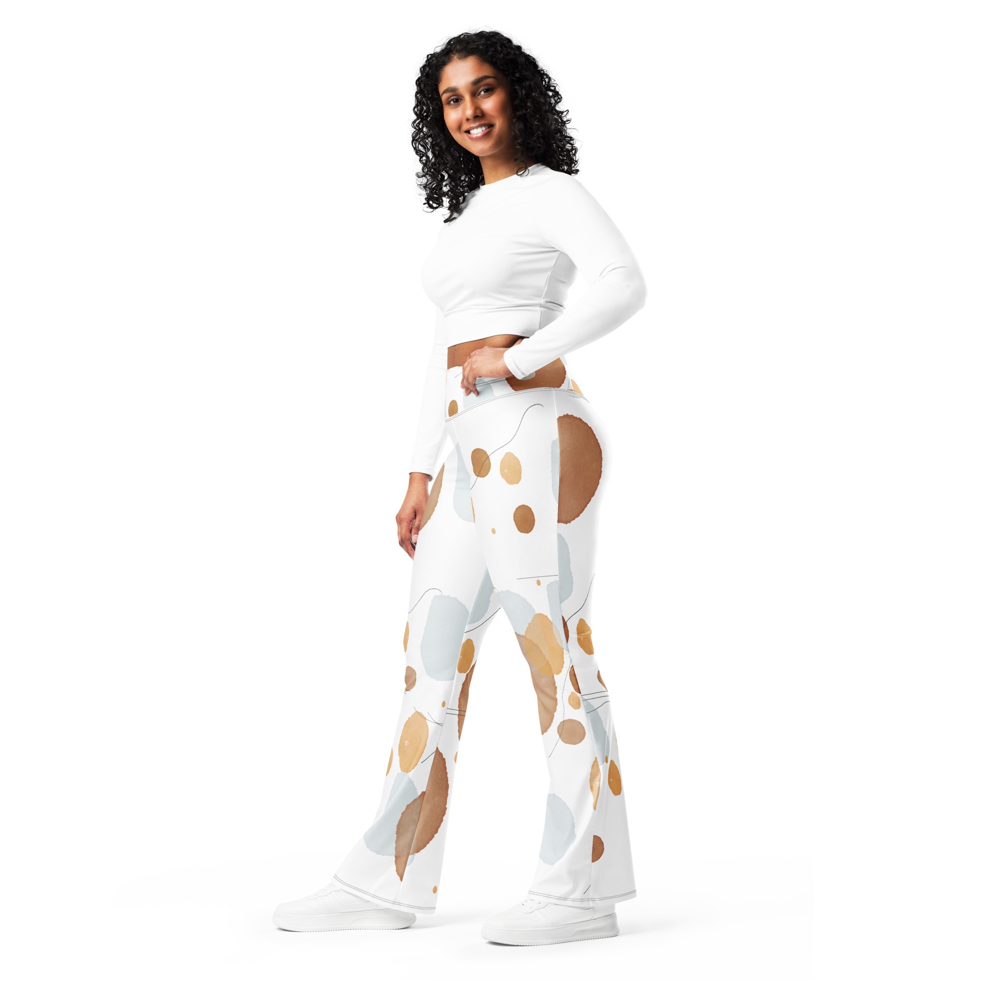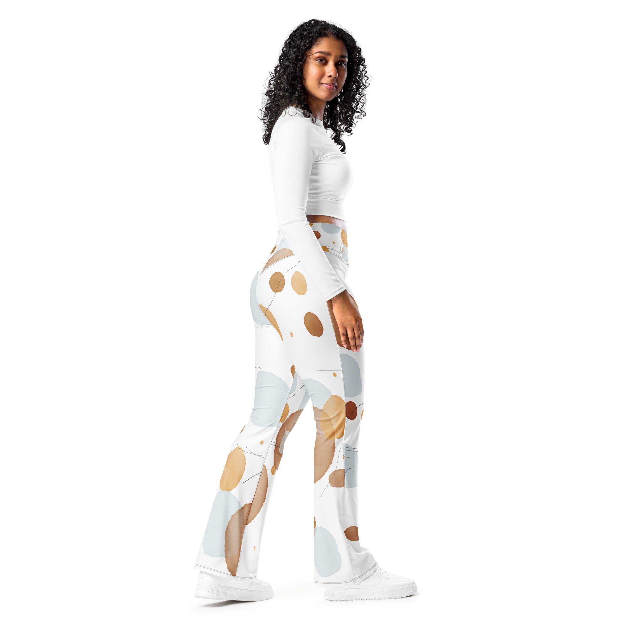 Designed to enhance your figure, these trendy leggings feature a high waist and a butt-lifting cut. The flared leg bottoms add a touch of style and make the leggings comfortable. Wear them on a walk, to the gym, or style them up with a bomber jacket or hoodie.